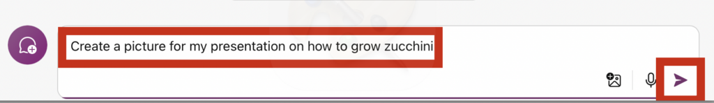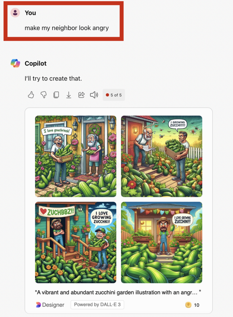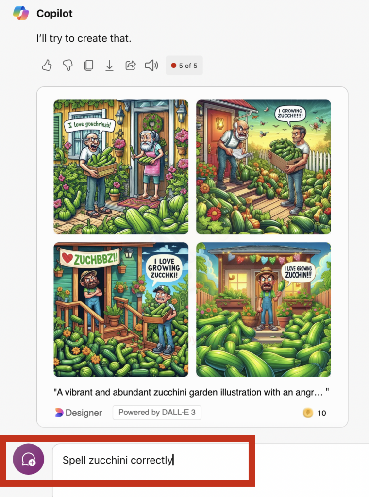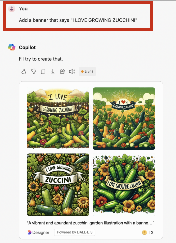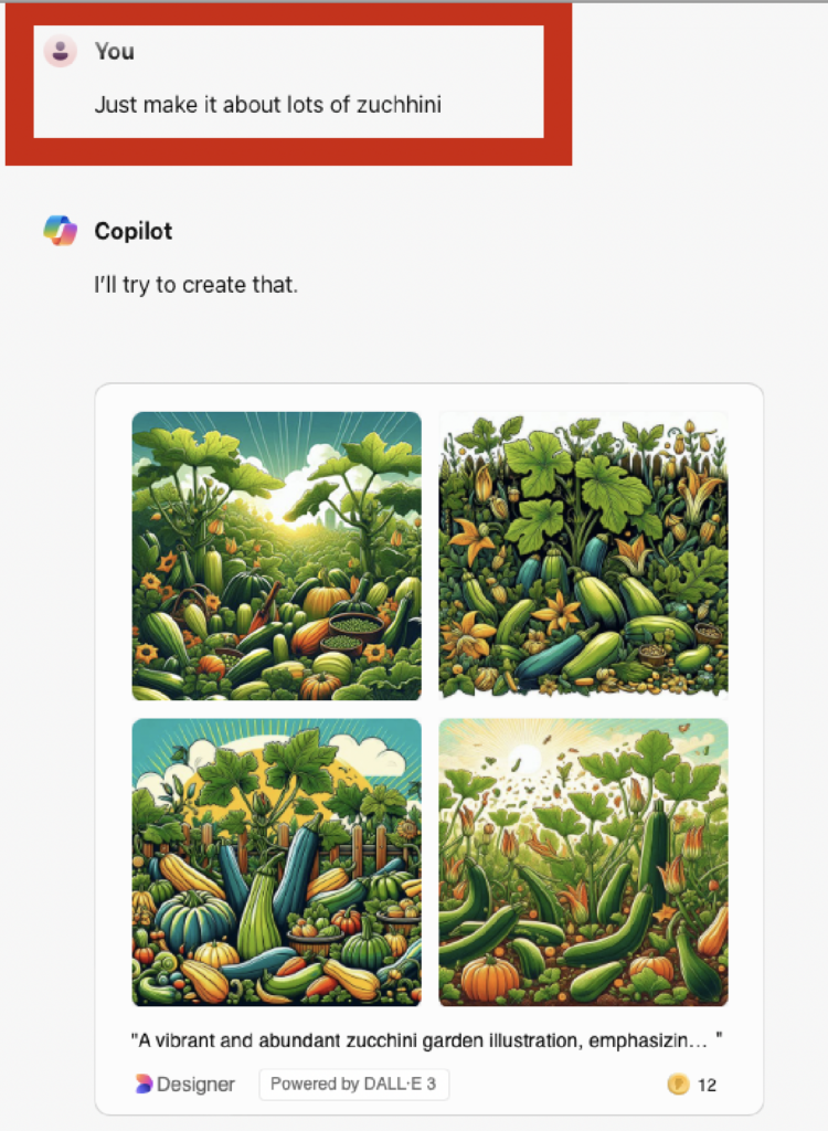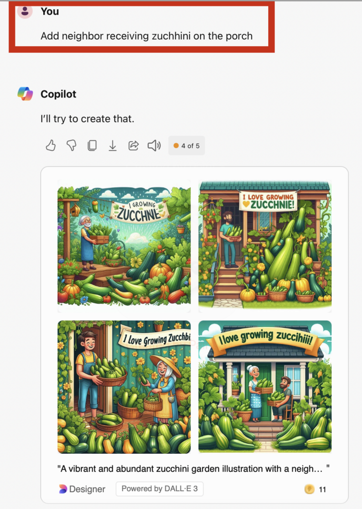 Once you submit the description, it will generate a picture. One thing I’ve observed is that it also incorporates past searches. I appreciate that it included my dog Maggie and Mango the kitty in my zucchini picture, although I’m not sure if they should be included in my presentation. Besides, who brings a business suit and laptop to the garden?