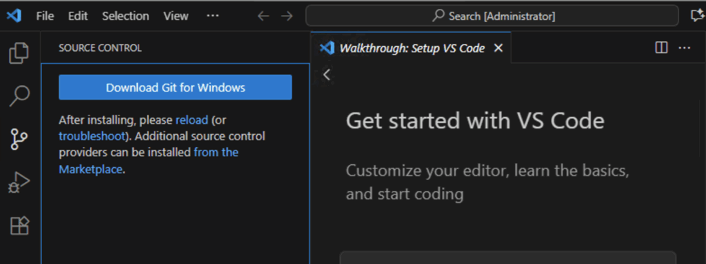 You can install Git by clicking on the “Download Git for Windows” in VS code