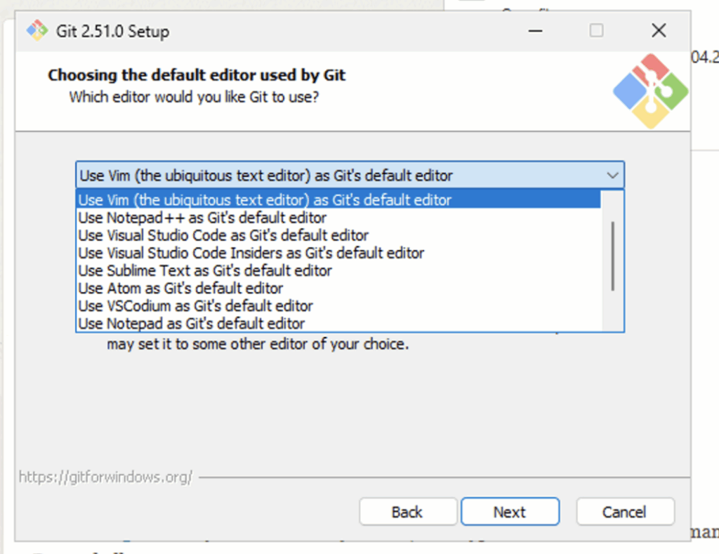 Git sometimes opens an editor to write commit messages or edit settings. Options include Vim, Notepad++, Visual Studio, Visual Studio Code, Sublime Text, Atom, VSCodium, and Notepad.