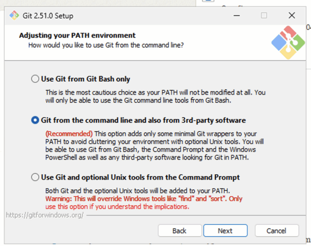 Recommendation: Choose “Git from the command line and also third-party software.” Why: It gives you the most flexibility. You can run Git in any terminal and VS Code will recognize it.