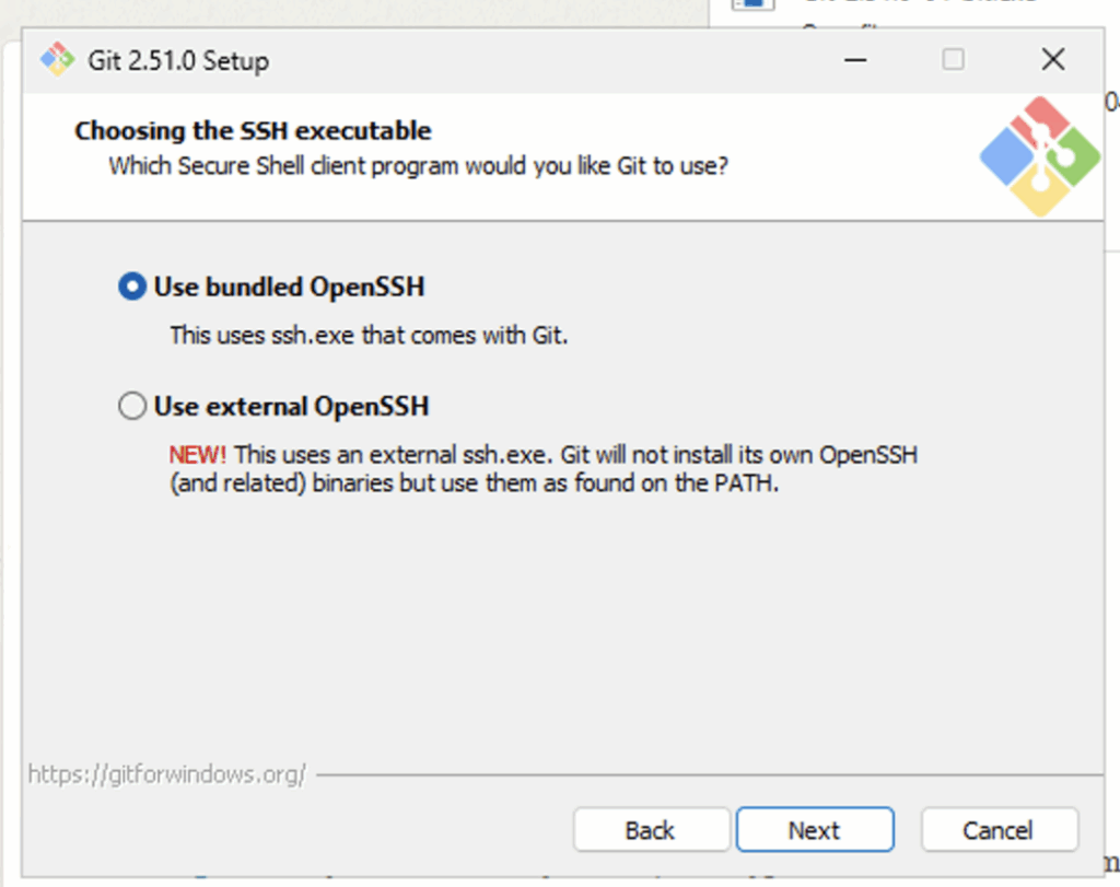 Recommendation: Choose bundled OpenSSH. Why: It works out of the box and avoids extra configuration.