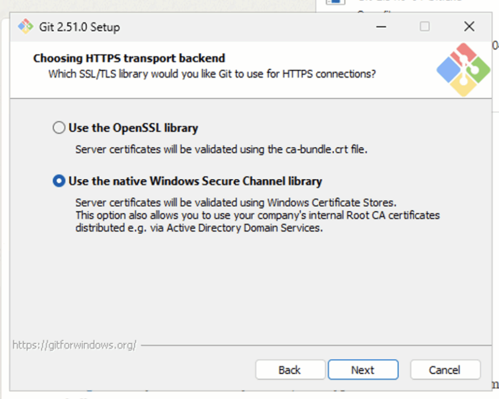 • Use bundled OpenSSH: Installs Git’s own version of SSH.
