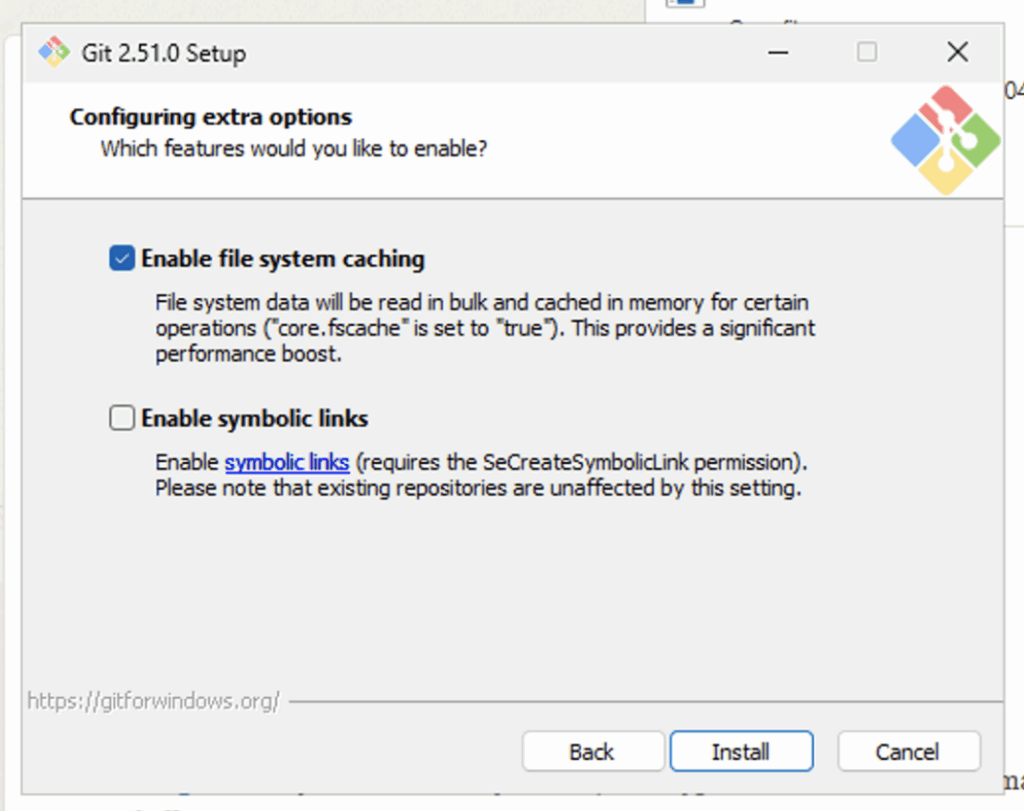 • Enable file system caching: Makes Git faster by caching file details.