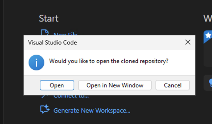VS Code will clone the repo and then ask if you want to open it. Click Open.