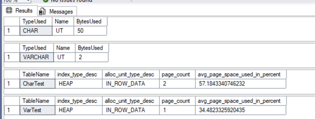 • dbo.VarTest using VARCHAR(50) for the Name column